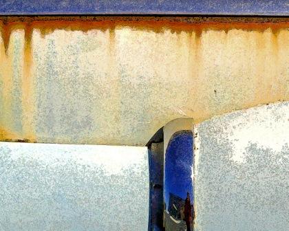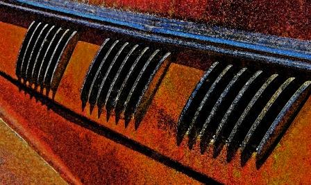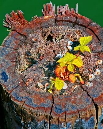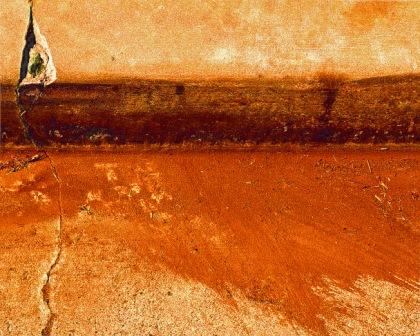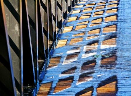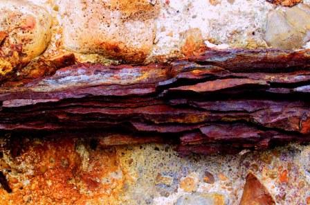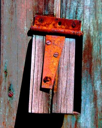 rusted mechanisms, rocks and rivulets of water, or splintered wooden posts